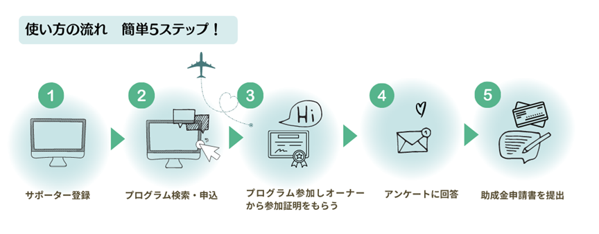 サポーターが助成対象プログラム参加のために、居住地から目的地の間を 移動する際に要する交通費及び宿泊費の一部を助成します。