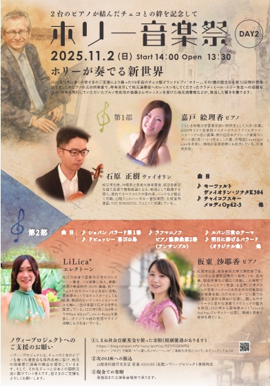 そしてDAY2の11月2日には、2部構成で、前半は、「ホリー」の持ち主であったチェコ国立ヤナーチェク音楽芸術アカデミーのウラディミール・ホリー先生から指導を受けた地元演奏家のヴァイオリンとピアノのデュオ。後半は、ピアノとエレクトーンの共演をお楽しみいただけます。