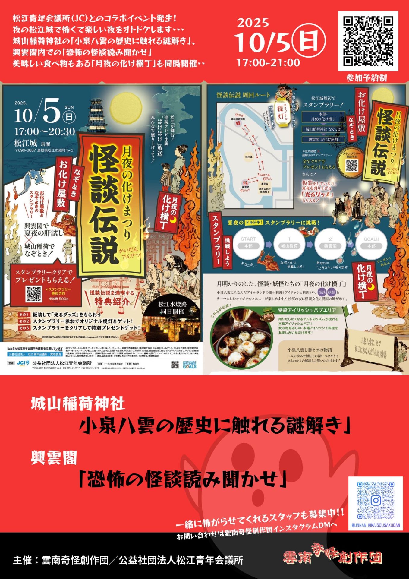 松江青年会議所との共同イベント「月夜の化け祭り怪談伝説」で、城山稲荷公園と興雲閣でのスタンプラリーをやります。