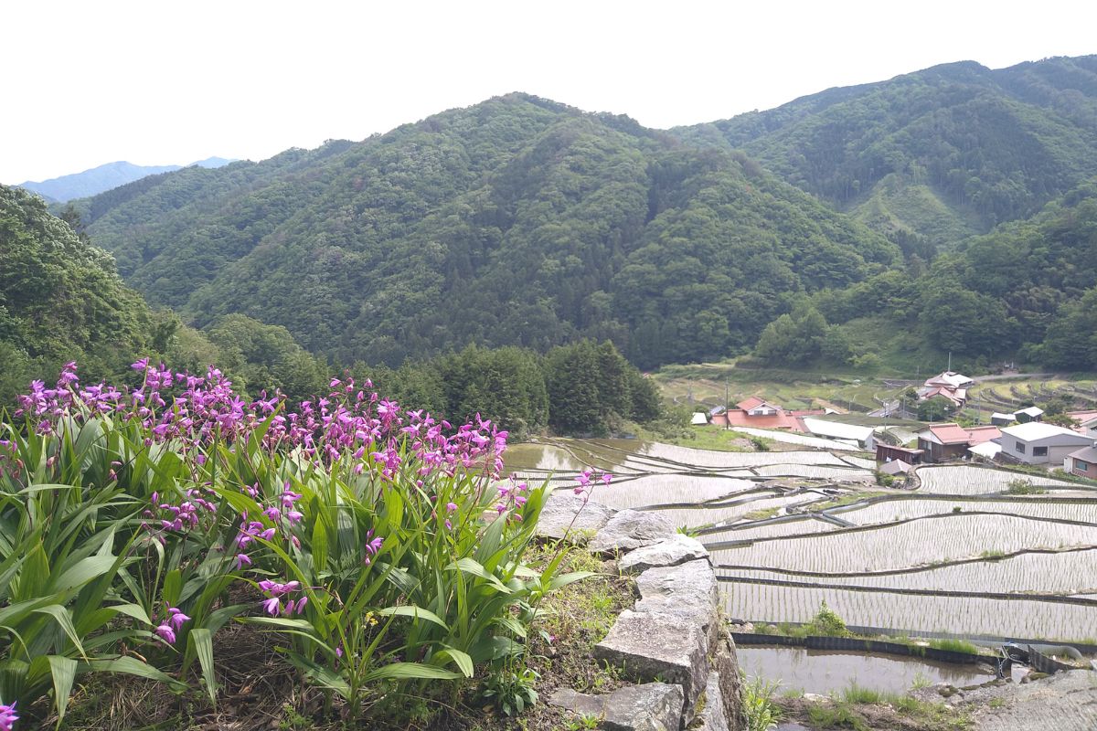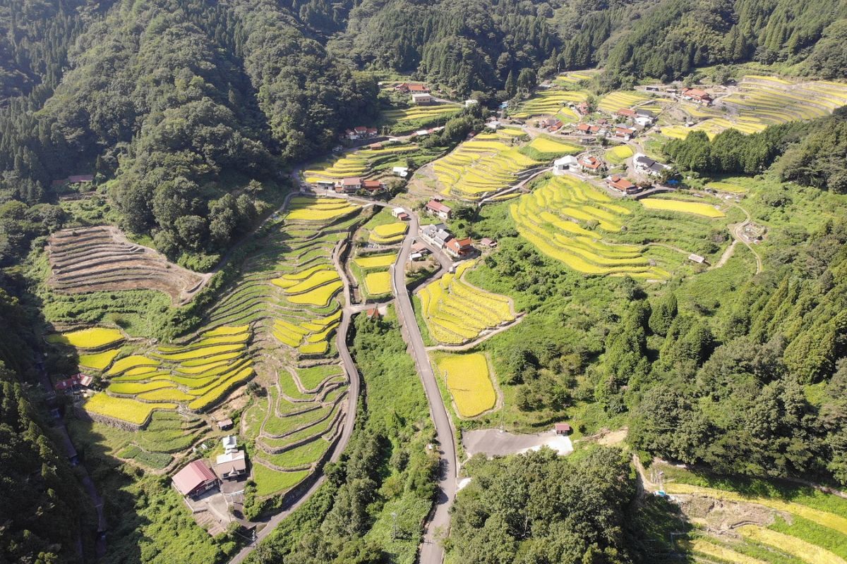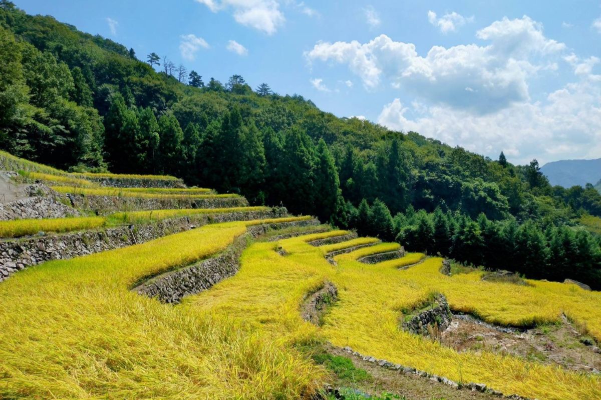 棚田全体が石積畦畔で造られ、その多くが乱層積の谷積で大井谷の住民が築いたもの。この石積と自然の調和はすばらしい景観を形成し、「日本の棚田百選」に選ばれるなど、高く評価されています。
