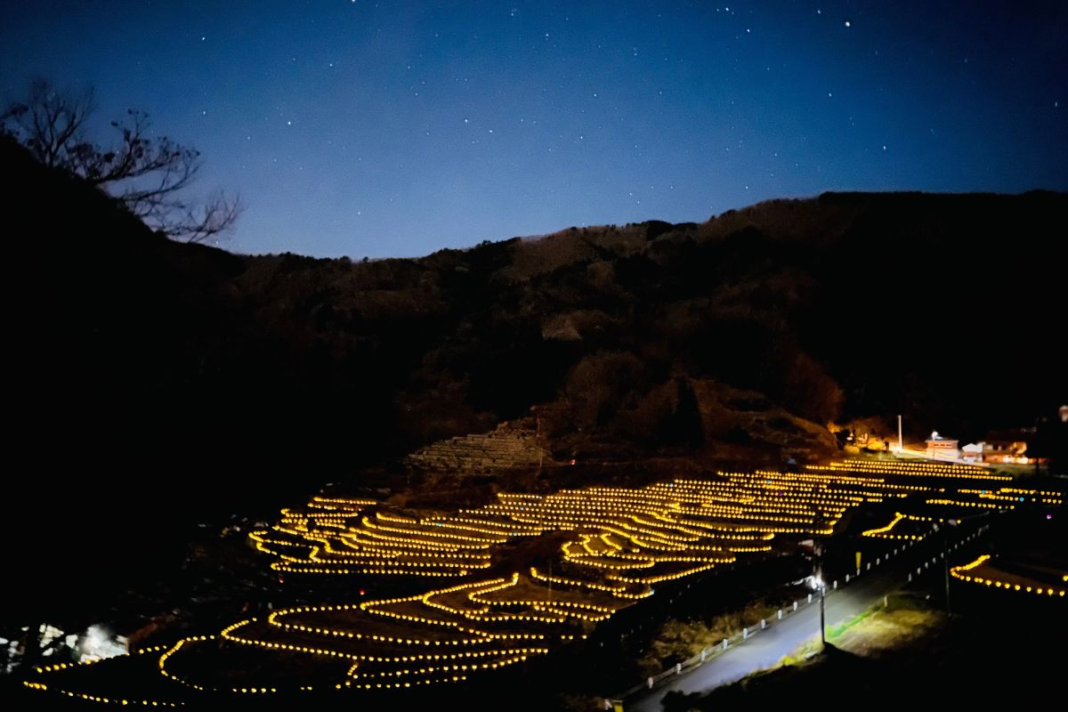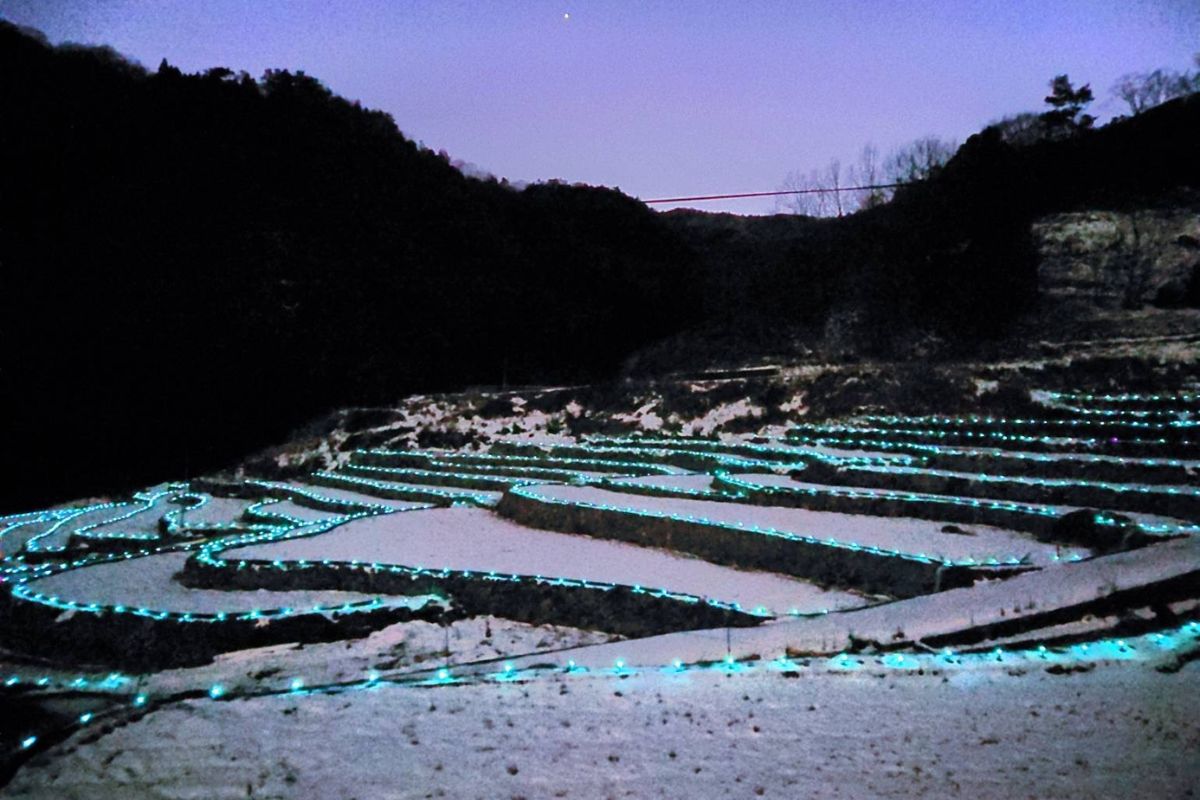 - 600年の歴史がある棚田で、冬の恒例ライトアップを今年も開催。15分間隔で4色(赤・金・青緑・紫)に変化するライトを設置し、あたりの風景をやさしく温かく照らし出します。2800本のソーラー充電式ライトを棚田に設置しますので、一緒にお手伝いしてくれる人を募集します。