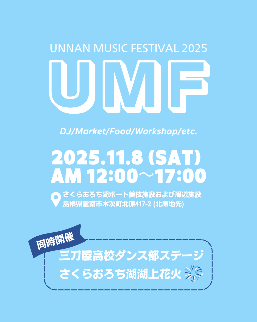 雲南市、実は音楽が好きな人たちがすごく多い地域。しかし、音楽に関するイベントがあまりない・・・。という気持ちから立ち上げた去年の第1回UMFプロジェクトに参加してくださった皆さんから、第2回目の開催も是非とも参加したいという言葉をいただき、開催することになりました!!