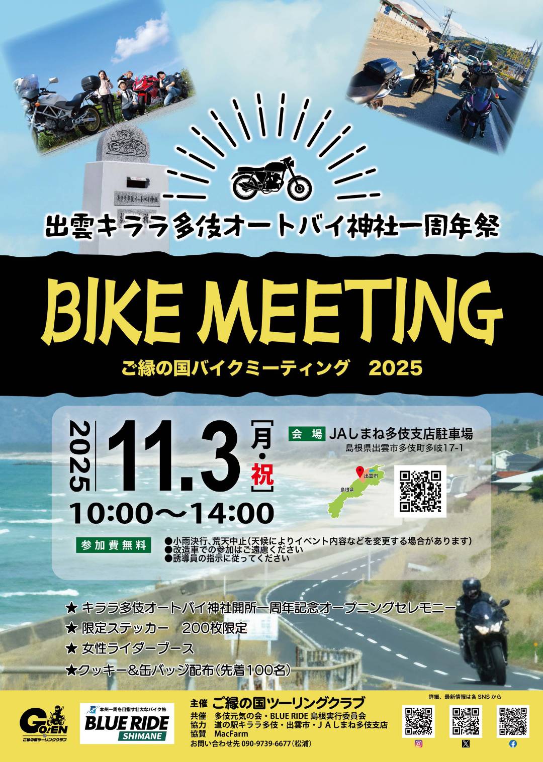 昨年出雲市多伎町に誕生した「第39号キララ多伎オートバイ神社」の一周年を祝い、全てのライダーの交通安全とライダー同士の交流、地域活性化を目的に、多伎元気な会、BLUE RIDE島根実行委員の皆さんと一緒に開催します。