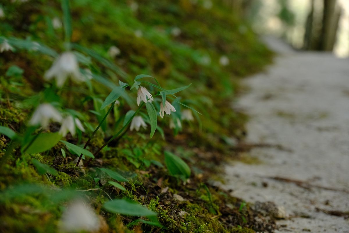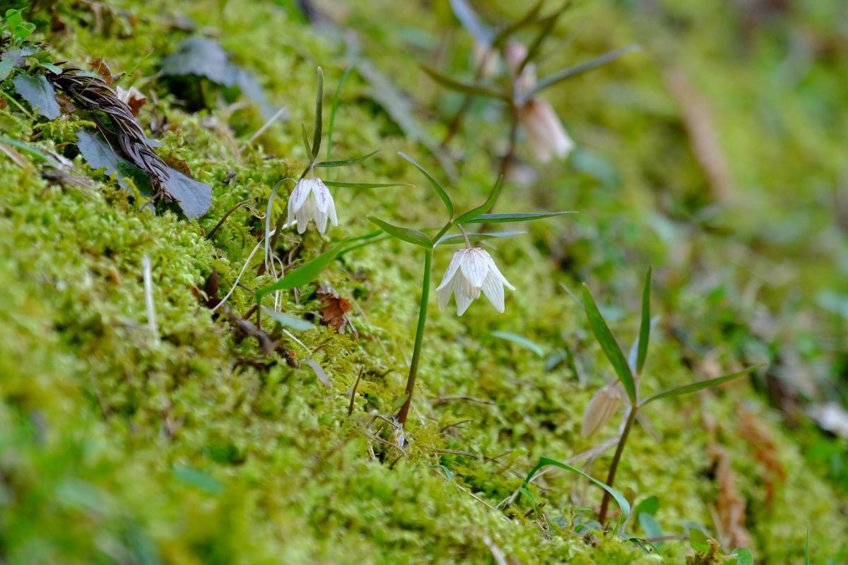 - 年3回ほどの作業のうち、今回はスギの枝拾いを実施。イズモコバイモは高さ10センチほどの小さな植物です。地上部に障害物があれば、うまく芽が出せないことも。翌春の開花に向けて、雪が降る前のこの時期に毎年枝拾いの作業を行っています。