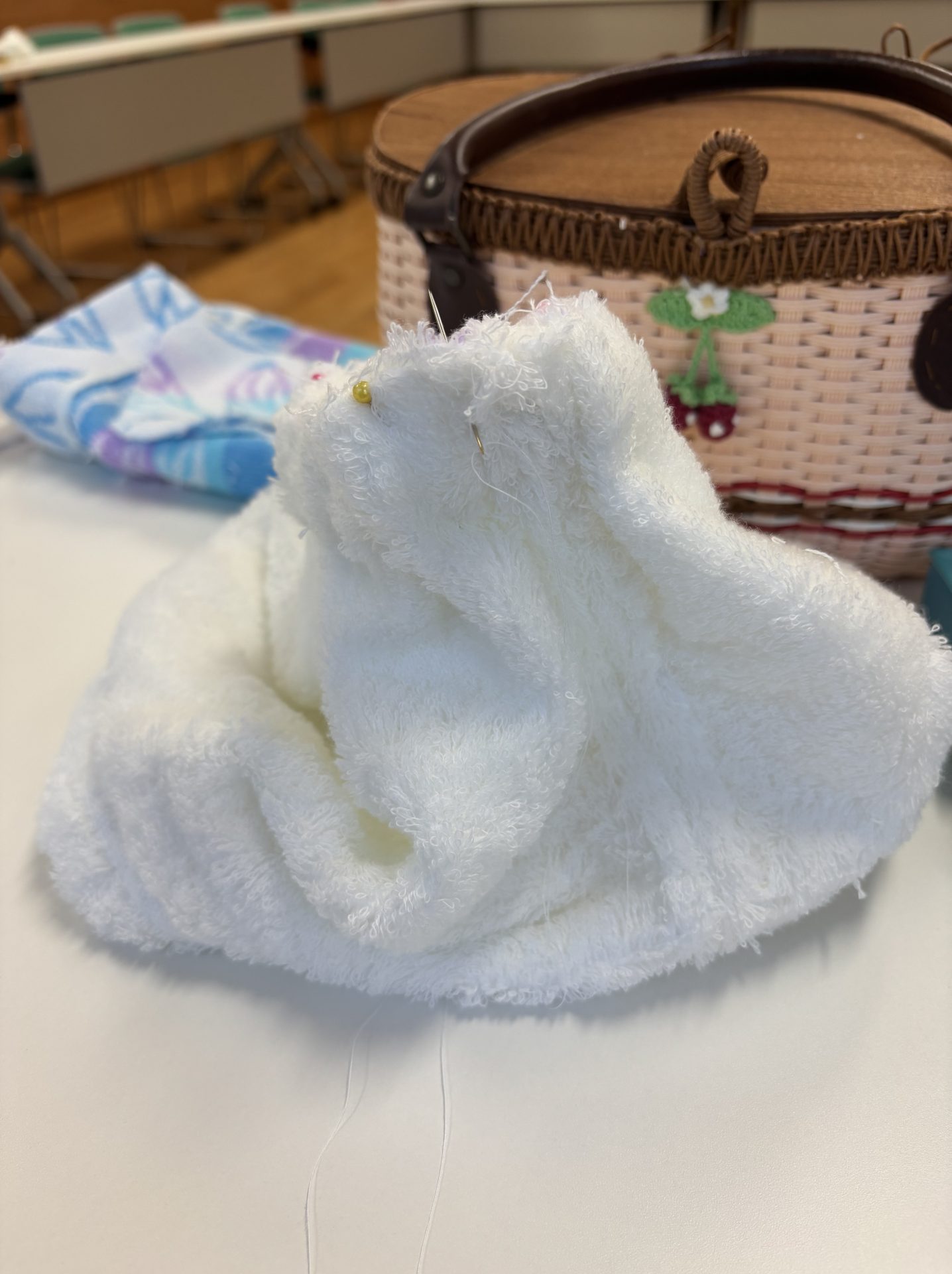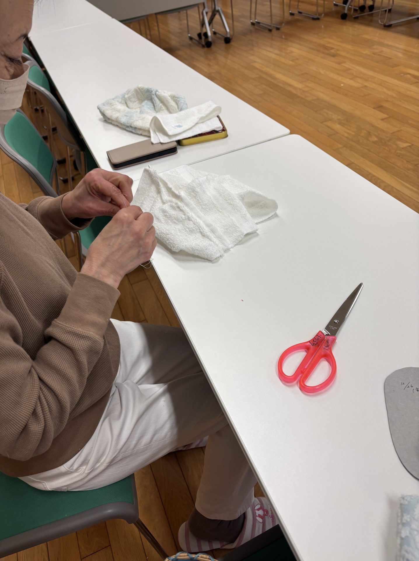 がん患者さんに贈る手縫いのタオル帽子の一部を作るお手伝い。