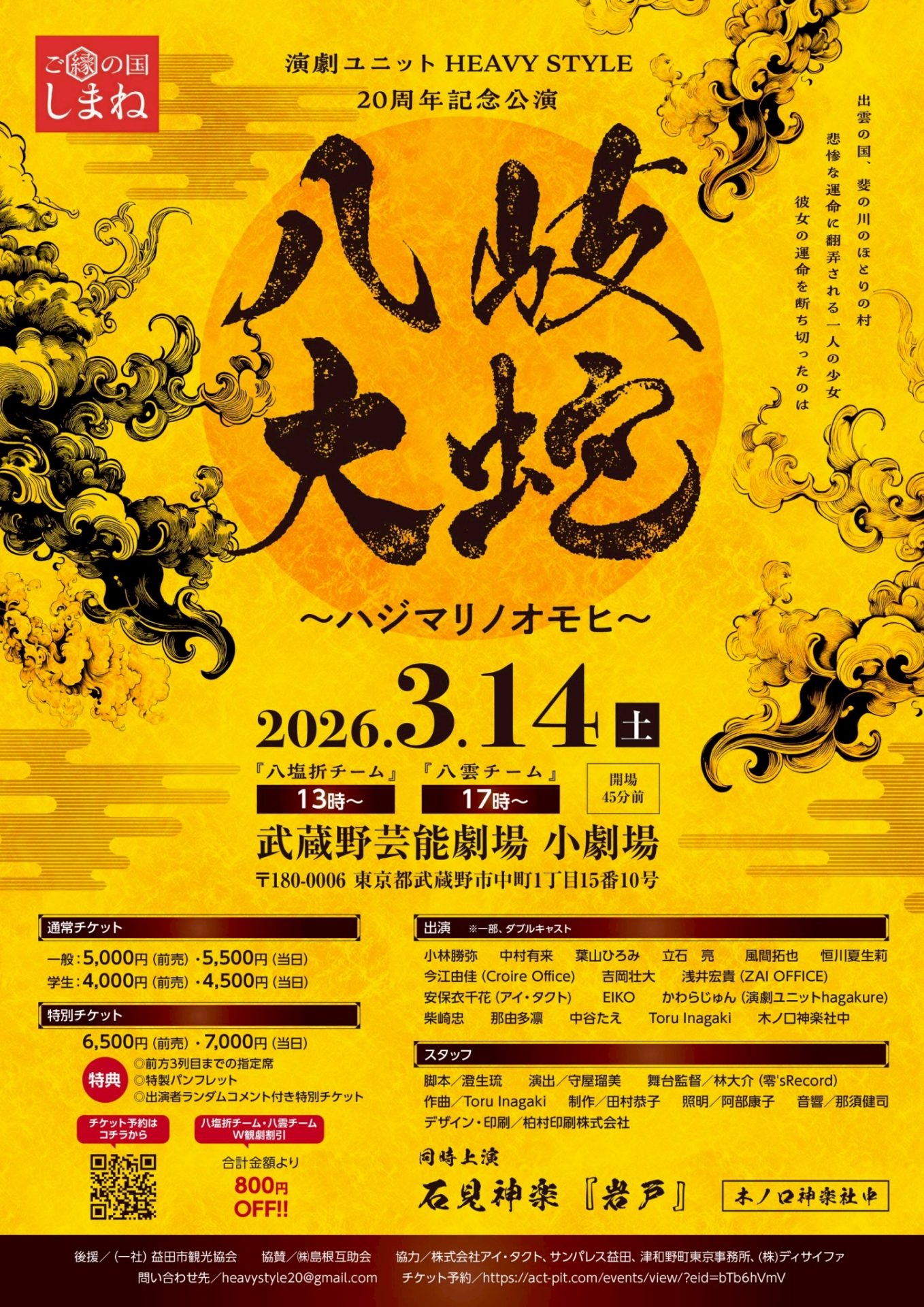 - 島根県益田市出身の役者、中谷たえが主宰する演劇ユニットです。 『好きな人と好きなことを』をモットーに、プロが本気でやる趣味というノリを重視しながら活動しています。 この度、20周年を迎えたにあたり、『大きな公演をしよう!』と、かつてグラントワで公演させていただいて以降、いつか関東でもと願っていた『八岐大蛇~ハジマリノオモヒ~』の再演を行なうことにいたしました。 役者は東京のメンバーに一新しておりますが、コラボしていただく石見神楽社中は当時と同じ津和野町の木ノ口神楽社中さんです。 第1部として、石見神楽『岩戸』の上演も行います。 現在、チケット予約もスタートし、クラウドファンディングも行っています。 クラウドファンディングのご支援や拡散のご協力。 また、島根県のPRをするにあたり、良いアイディアやご協力をお願い出来たらと思っております。 主宰の中谷個人としても『島根県と東京を繋ぐ架け橋の一端に』を目標にしており、この公演を通じても島根県の魅力の発信に繋がればと願っております。