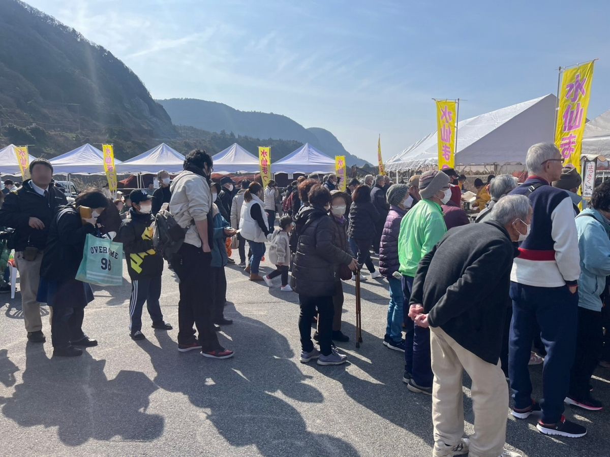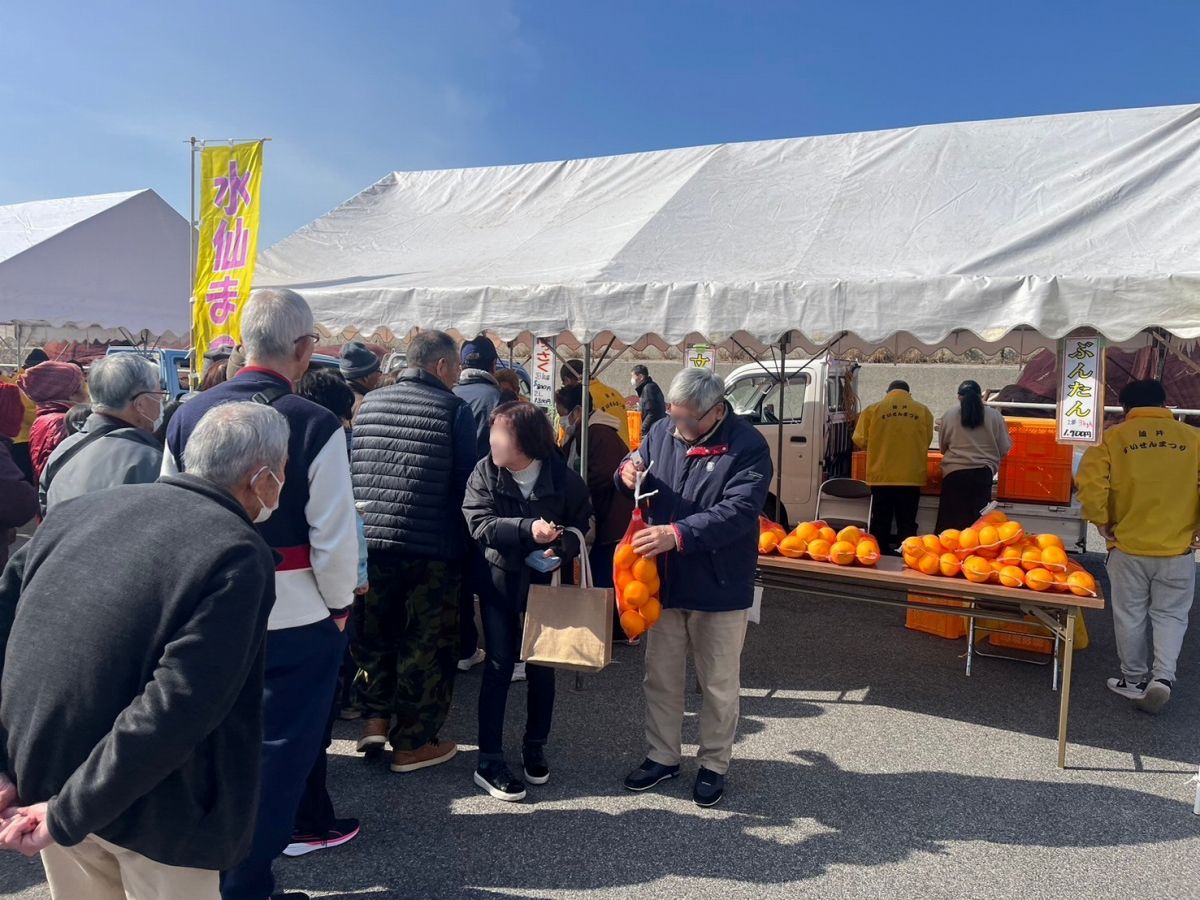 「地元の良いものを届けたい」という想いで始まった油井すいせん祭り。毎年2月頃に開催し、地元生鮮食品の販売、カニ汁・水仙切り花の配布、ジオパーク散策などを行い、たくさんの人で賑わいます。