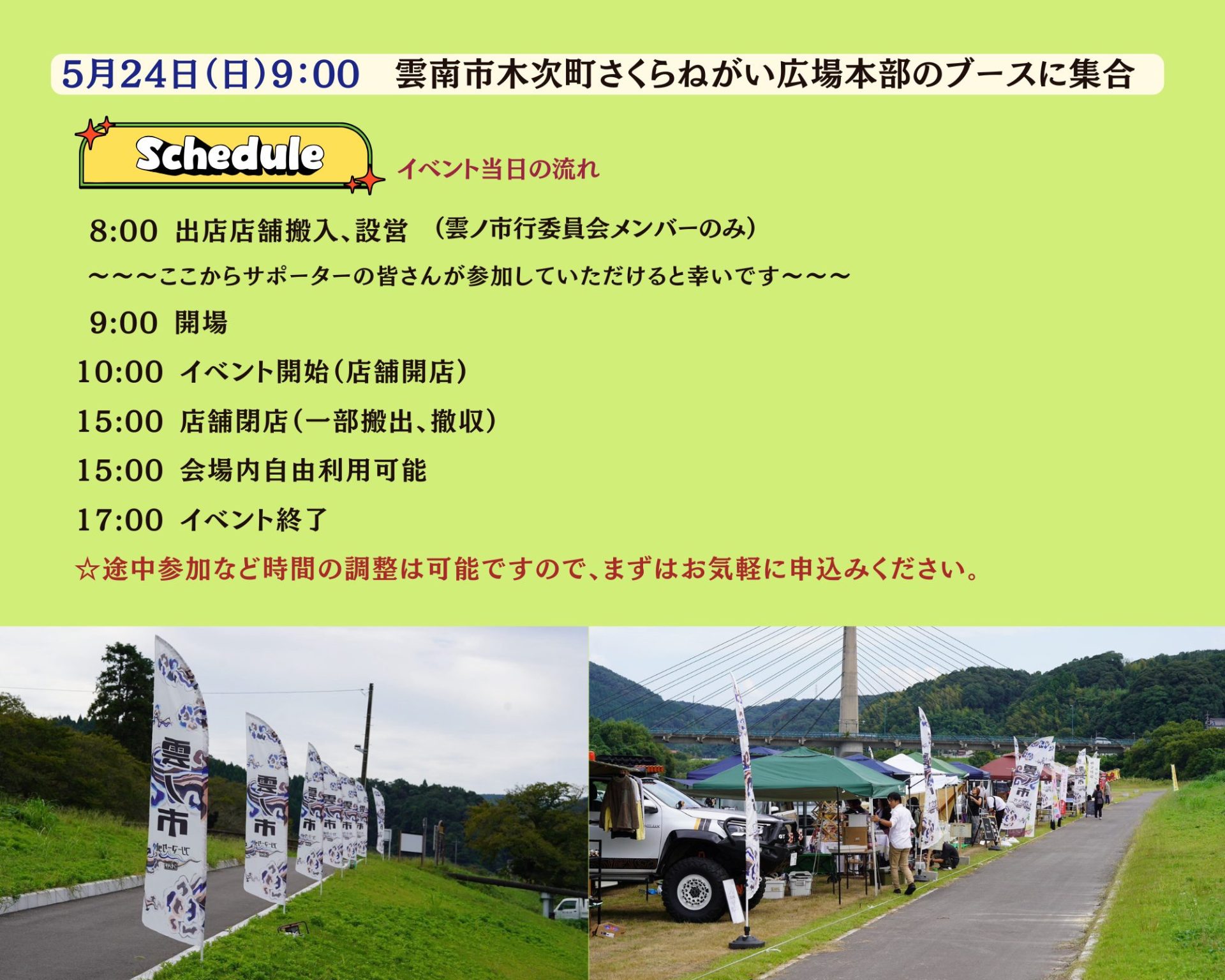 - 雲南市木次町の「さくらねがい広場」で5月24日(日)に「第3回雲ノ市 (クモノイチ)」フリーマーケットを開催します!ぜひ運営サポーターとして、参加いただき、イベントを一緒に盛り上げてくれませんか?