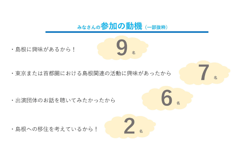 - イベント等に参加する、ちから仕事で貢献する、スキルや知識を活かす、企画・運営に携わる、地元の人と交流する、島根の○○を学ぶ、島根をPRする