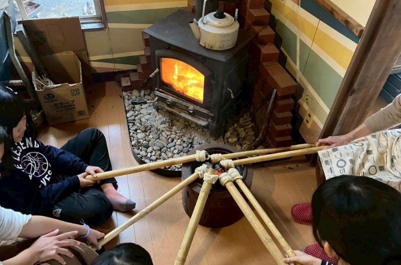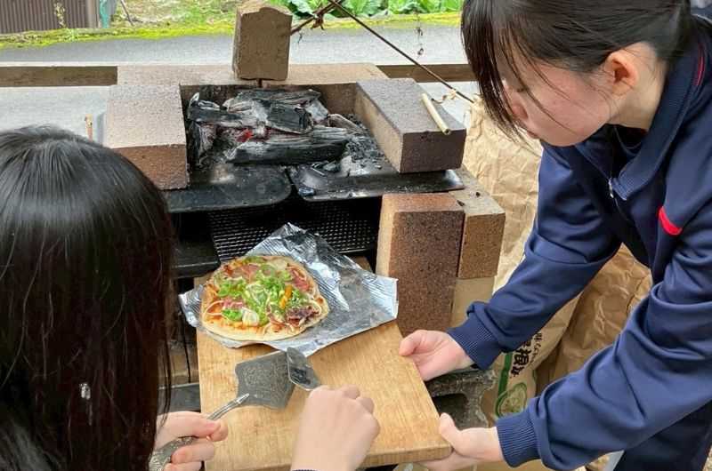 高校生達が屋外で何やら火をおこし始めました。耐火レンガで組んだピザ窯に、火を入れてピザ作り。