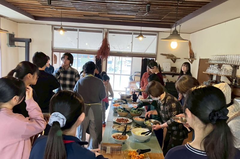 参加者が持ち寄る食材や、生産者さんから分けてもらう規格外や余剰野菜などを活用し、一緒に調理してみんなで食卓を囲む月に一度の地域食堂。今回は地元のばあちゃんや小学生、学生寮からやってくる高校生、第二の故郷と津和野を慕う大学生、中にはたまたま地図で見つけて足を運んでくれた方もいました。