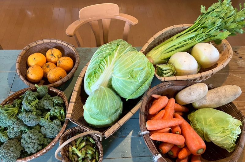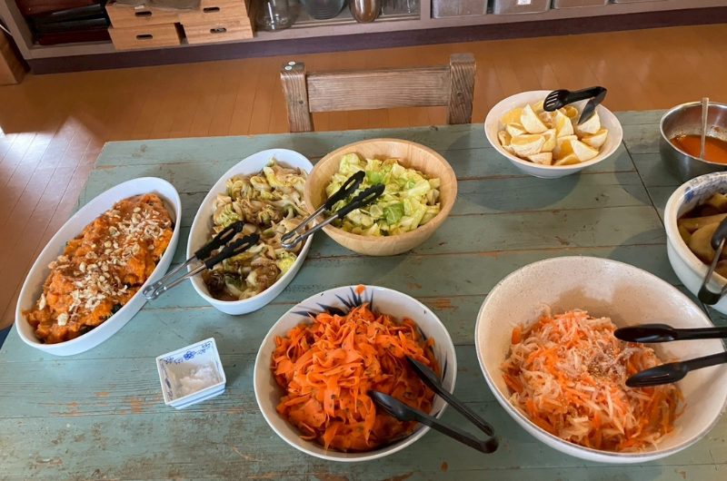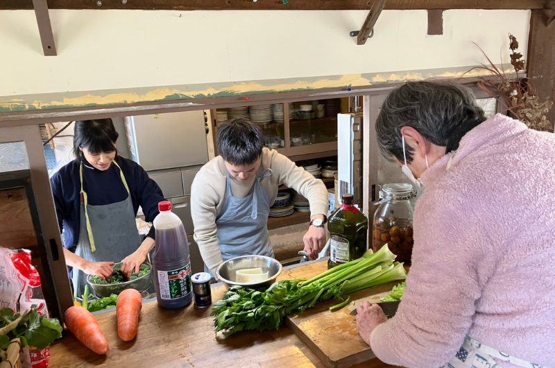 農家の方々に分けていただく余剰野菜や参加者の持ち寄り食材を活用し調理します。決まった献立はなく、その日に集まった食材を見て皆で相談します。