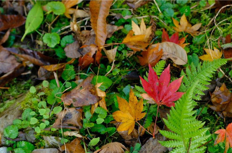 小さなコバイモは、地上部に少しでも障害物があるとうまく芽を出せないことがあるため、枝拾いは大事な作業。地面に当たる日照を確保することや、春に芽を出す際の阻害物を除くことが目的です。