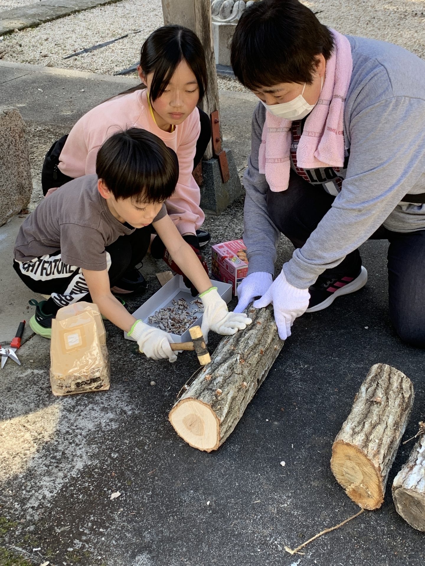 原木に穴をあけ、種コマ(しいたけ菌)をかなづちで打ち込む作業を通して、里山資源の活用と自然循環の仕組みを体験する内容です。