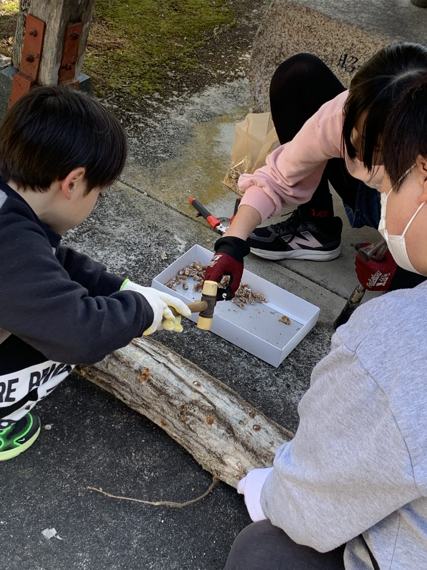 今回は、公園内で伐採した原木を活用した「しいたけの菌打ち体験」を実施。