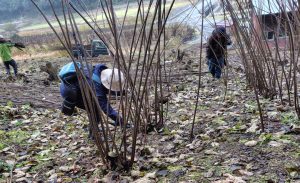 長い時間(8:30~16:30)作業をすることで、体中が筋肉痛になる人が多かったようです。特に、楮(こうぞ)の原木刈取り・結束作業では、力仕事が中心のため、苦労をされていましたが、刈取りに電動のハサミを使うことに感激をされていました。