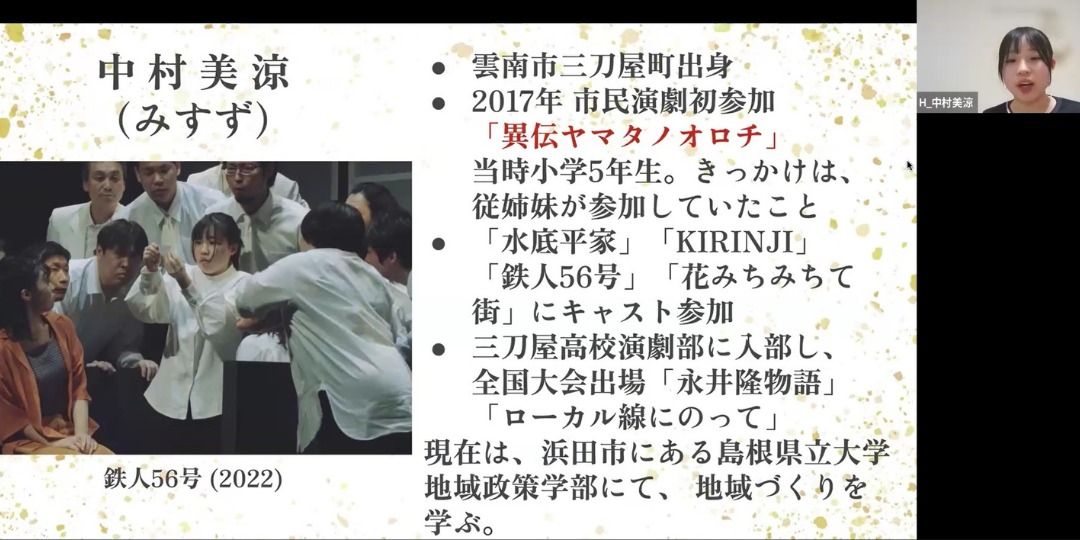 中村さんからは、雲南市三刀屋町出身で、小学5年生だった2017年に「異伝ヤマタノオロチ」で市民演劇に初参加したこと、以降「水底平家」「KIRINJI」「鉄人56号」「花みちみちて街」にキャスト参加してきたことが紹介されました。現在は島根県立大学地域政策学部で地域づくりを学びながら、演劇を通じて雲南との関わりを続けているそうです。