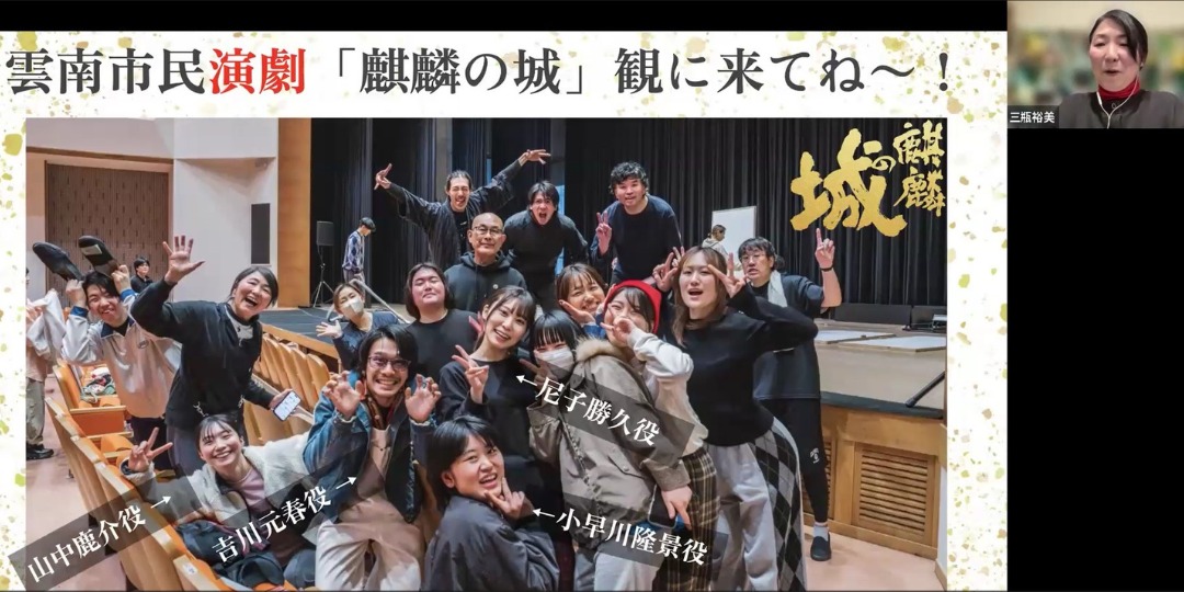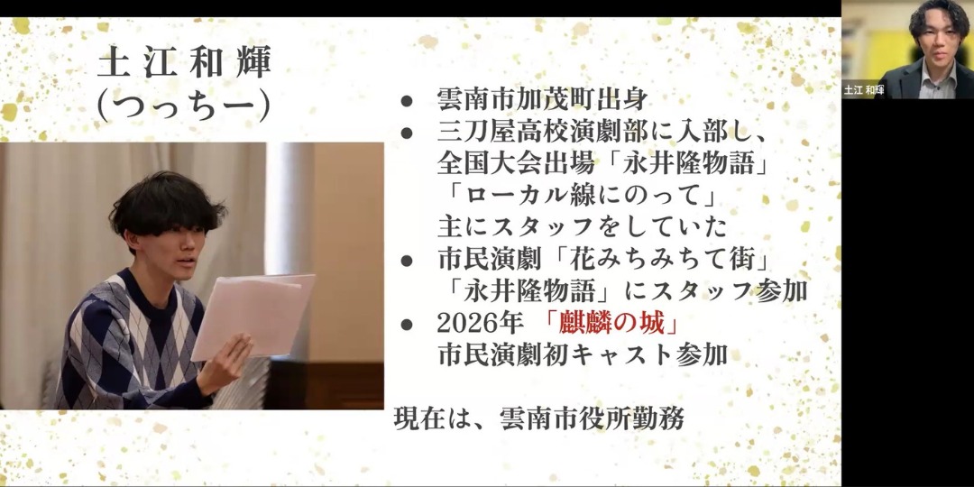 土江さんからは、雲南市加茂町出身で、高校の演劇部時代には「永井隆物語」「ローカル線にのって」で全国大会に出場し、これまで市民演劇では主にスタッフとして関わってきたこと、そして2026年の「麒麟の城」で初めてキャストとして参加することが紹介されました。現在は市役所に勤務しながら、公演づくりに取り組んでおられます。