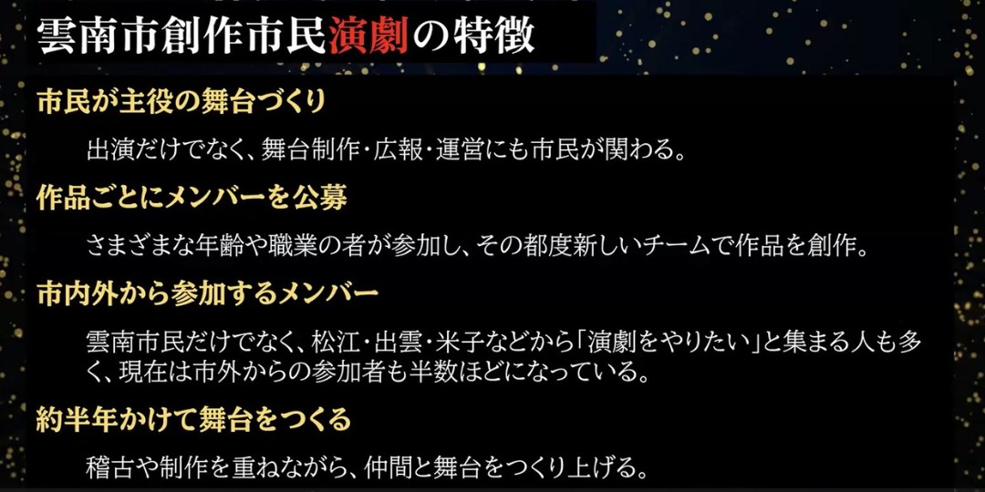 また、雲南市民演劇は単なる舞台公演ではなく、人づくり・関係づくりの場でもあると紹介されました。