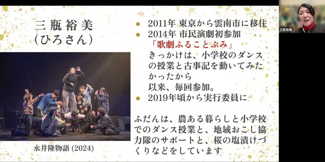 三瓶さんからは、2011年に東京から雲南市へ移住し、2014年の「歌劇ふることぶみ」で初めて市民演劇に参加したこと、その後は毎回参加し、2019年頃からは実行委員としても関わっていることが紹介されました。現在は、農ある暮らしや小学校でのダンス授業、地域おこし協力隊のサポート、桜の塩漬けづくりなど、地域に根ざしたさまざまな活動にも携わっておられます。